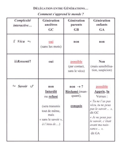 Ce qui n’est pas sans interroger aussi sur le rôle de l’école, en cette affaire de transmission : quand prend-elle le relais sur ce qui ne passe pas, ne peut plus passer générationnellement, en termes de savoirs ? À partir de quand un événement majeur difficile est-il inscrit et métabolisable dans les manuels scolaires ? Où se place l’école dans le tableau suivant ?